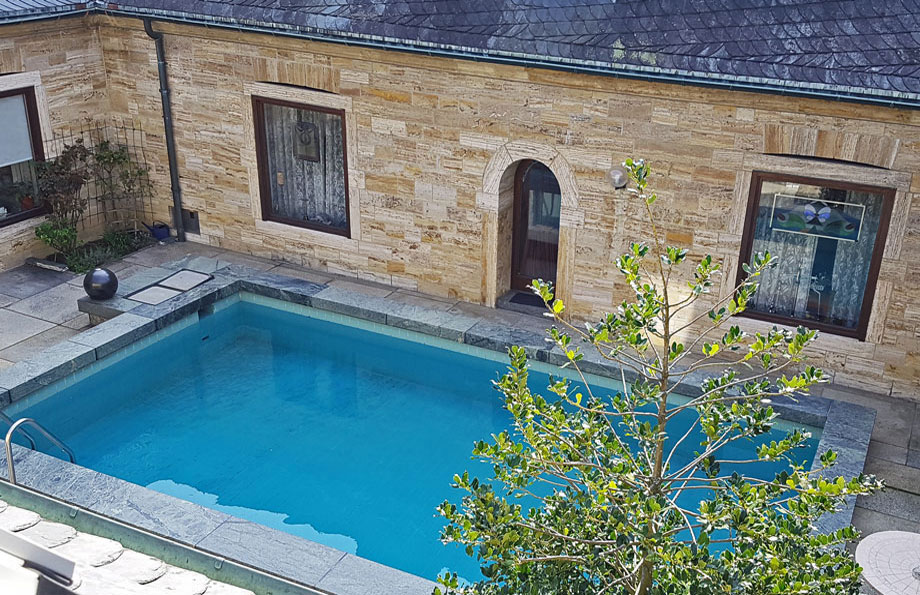 Wohnfläche: 210 m² Highlights: Naturtseinmauerwerk, Jagdzimmer, Pool Standort: Stuttgart - Heumaden